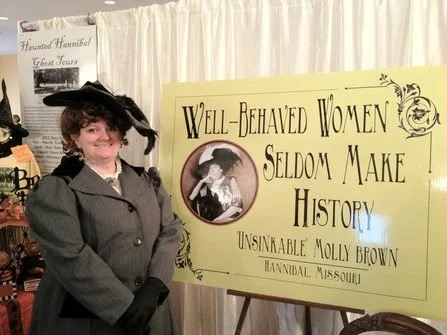 It was my honor to tell Molly’s story, beginning with the 100th Anniversary of the sinking of Titanic in 2012. In addition to serving as the Executive Director and Curator of the Molly Brown Birthplace and Museum, I also appeared as Molly, performing throughout the Midwestern United States as a member of the Missouri Humanities Council Touring Performers and the Missouri Arts Council Speaker’s Bureau. After writing the book, Molly Brown from Hannibal, Missouri, (published by The History Press/Arcadia Publishing), I was asked to do numerous book signings and public appearances with Molly Brown’s great-granddaughter, Helen Benziger, at both Titanic Museums in Branson, Missouri and Pigeon Forge, Tennessee.